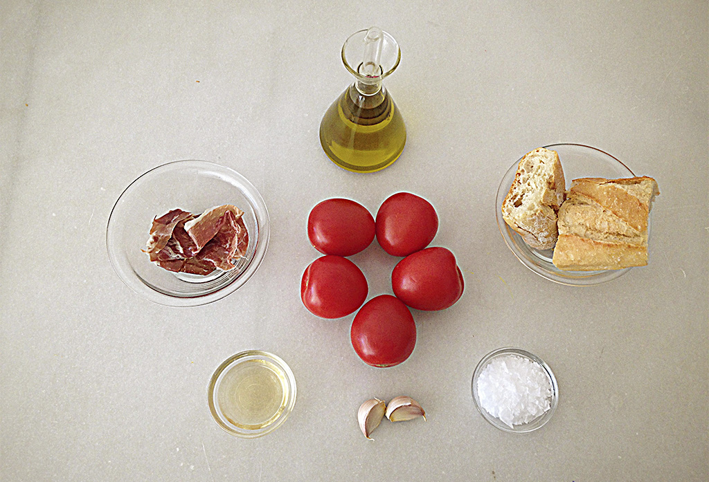 La base del salmorejo, es tomate, pan, aceite, ajo, vinagre y sal, de textura espesa